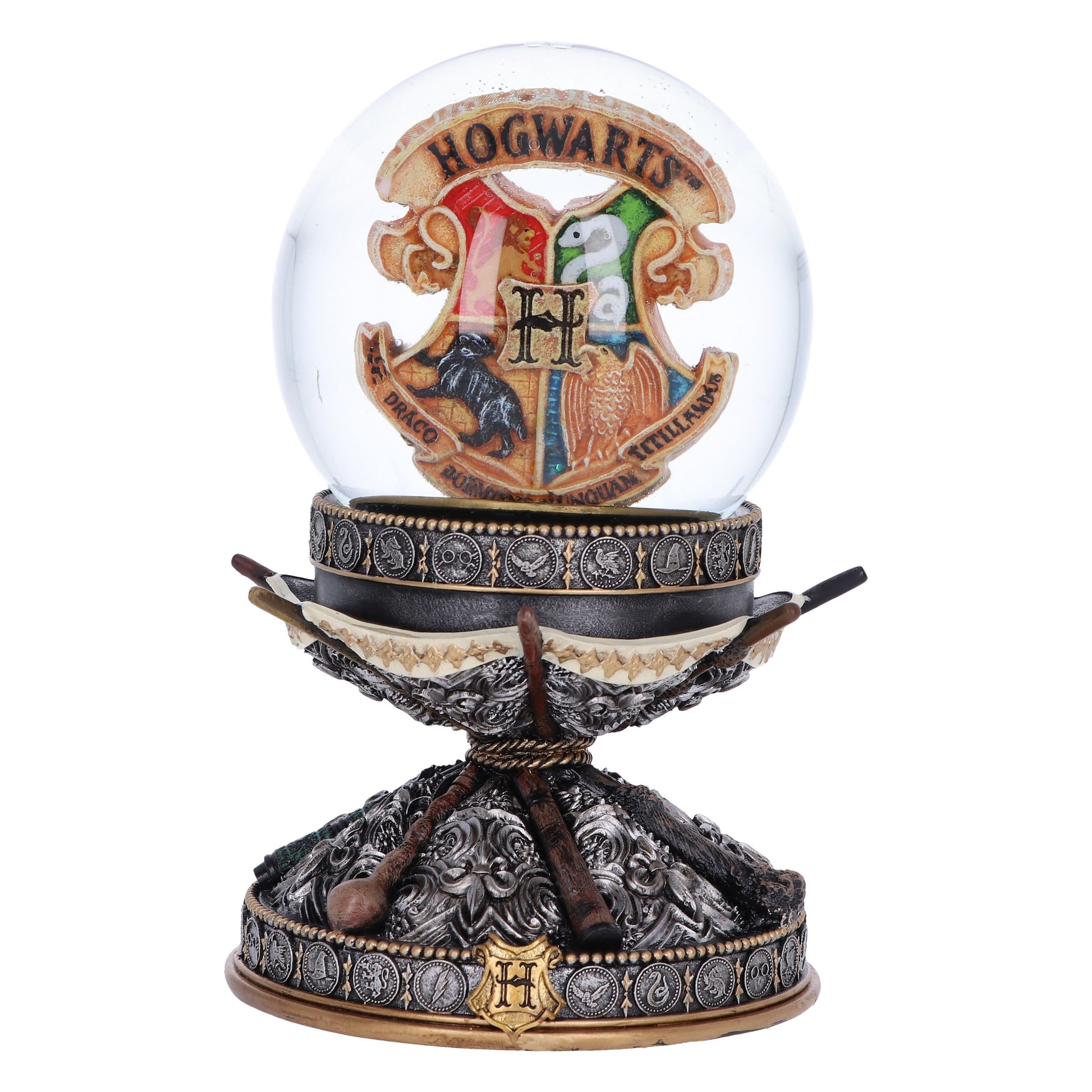 This officially licensed Harry Potter snow globe features the iconic Hogwarts crest at its center, surrounded by seven magical wands and various Hogwarts-themed symbols at its base.