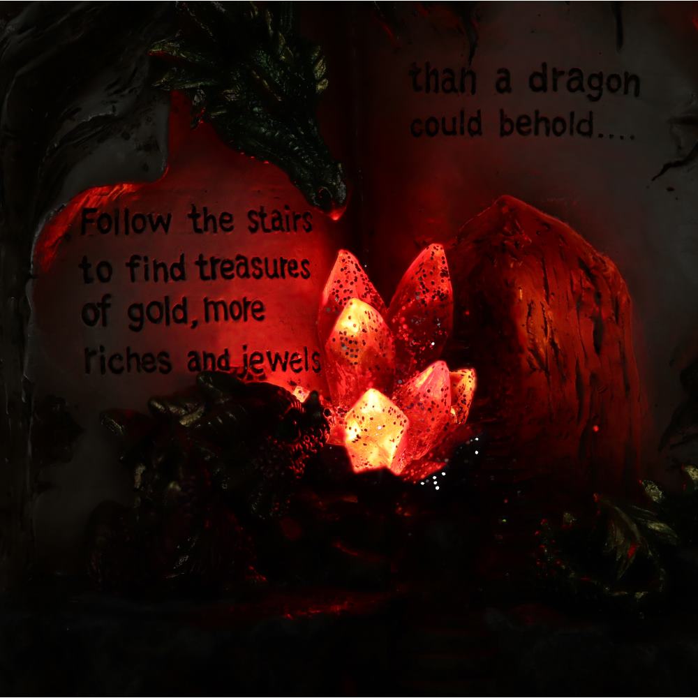 The pages of the book read 'Follow the stairs to find treasures of gold, more riches and jewels than a dragon could behold'.